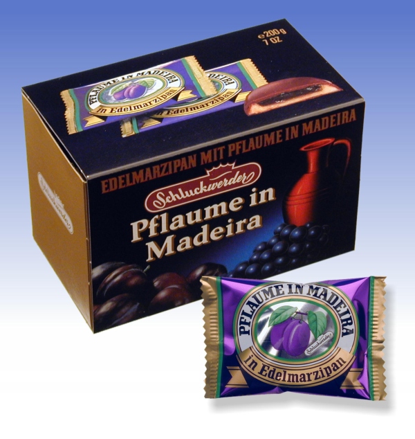 Pravý mandľový marcipán so slivkovou náplňou obalený horkou čokoládou.